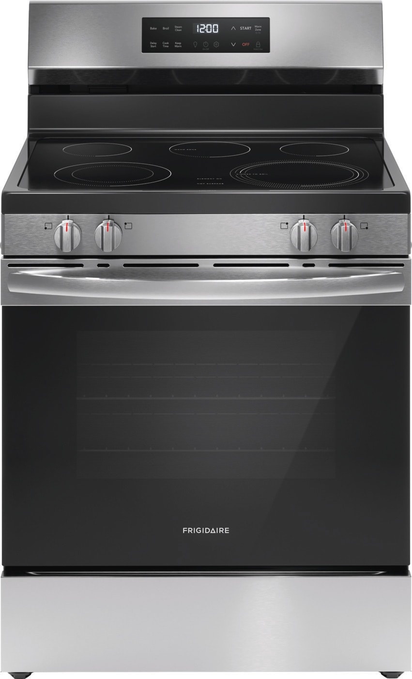 BackHomeFRIGIDAIRE 5 Burner Element Freestanding Electric Range in Stainless Steel with EvenTemp and Steam Clean MODEL# FCRE3062AS Stock# 8004-17