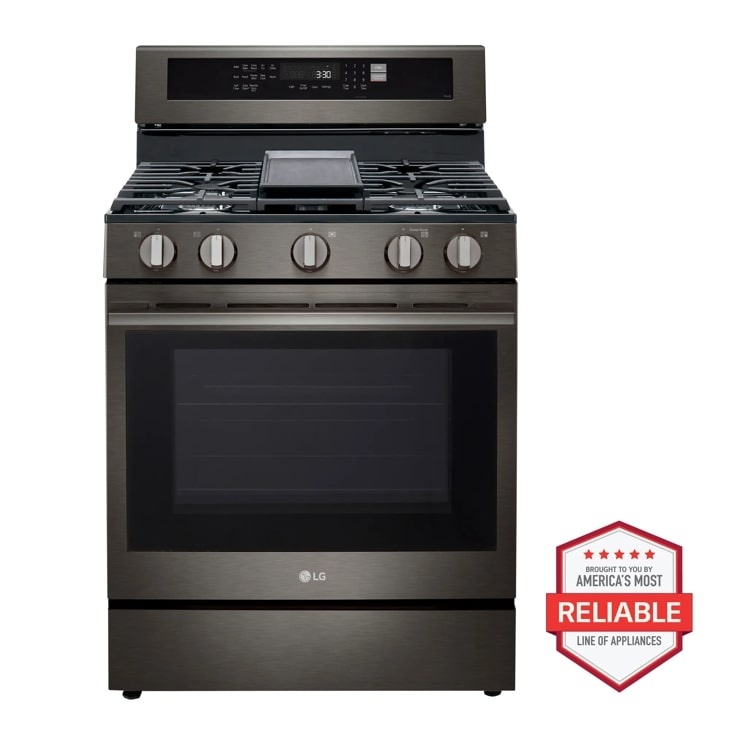 BackHomeAir Quality ManagementLG 30-in 5 burners 6.3-cu ft Air Fry Convection Oven Freestanding Natural Gas Range ( Black Stainless Steel ) Model# LRGN6325Z